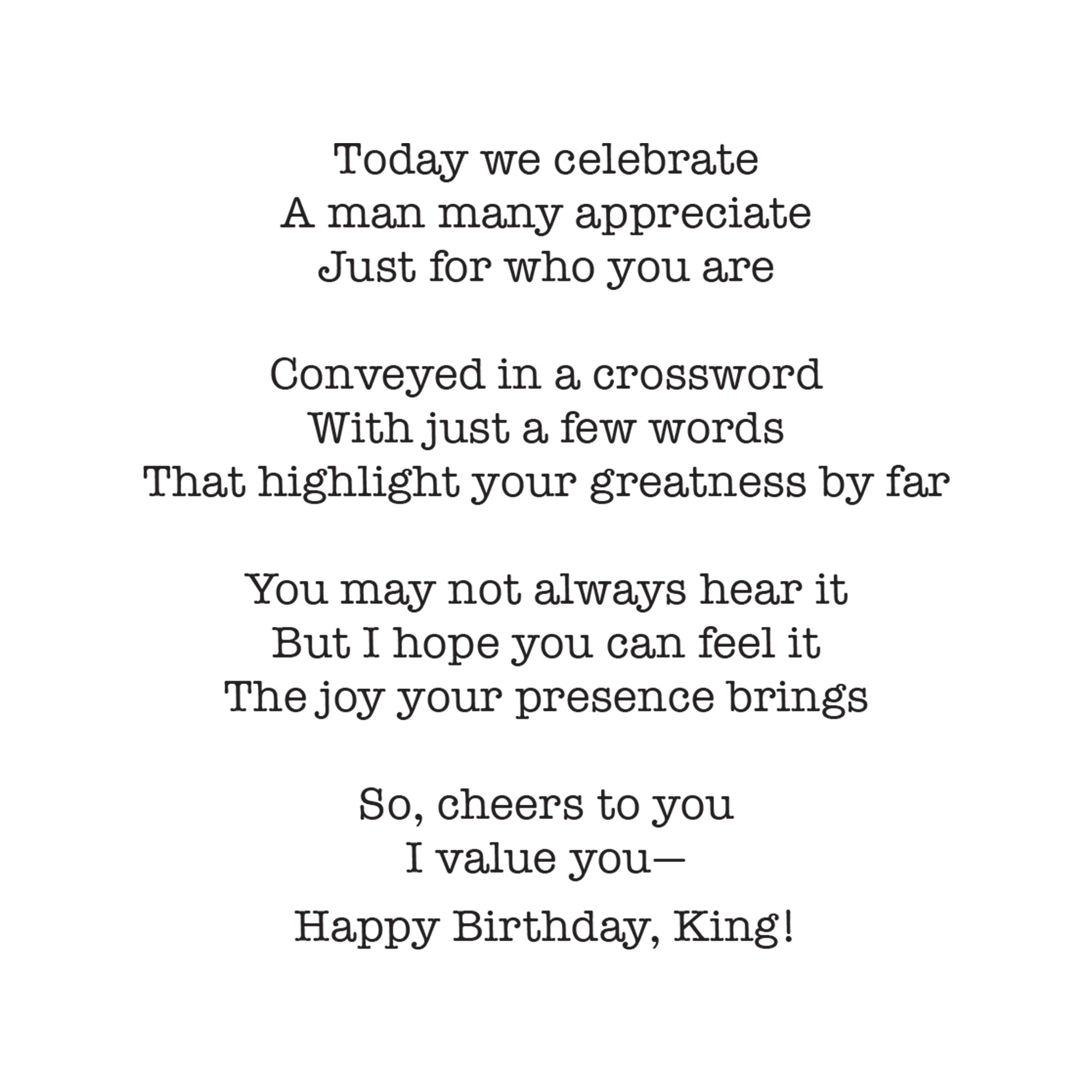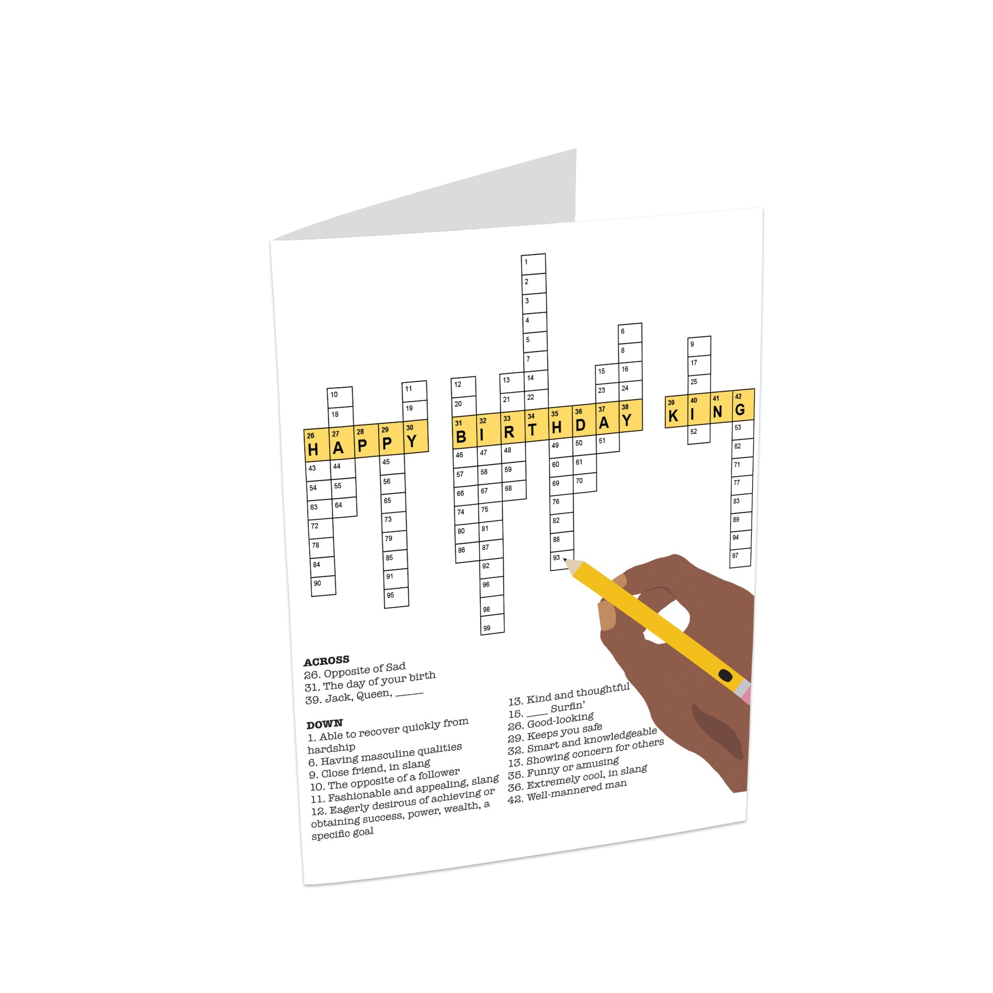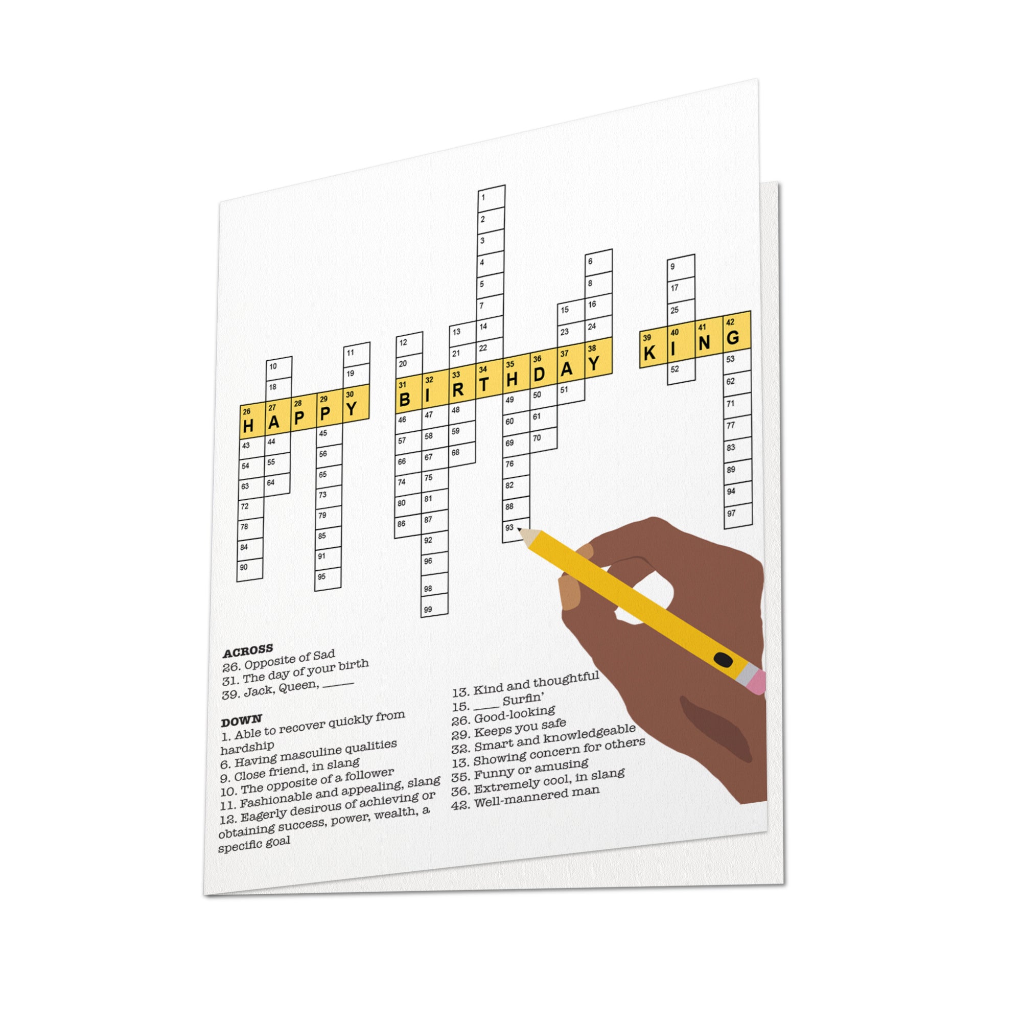 Celebrate your King in a fun and unique way with this African American birthday greeting card. Featuring a playful crossword filled with clues highlighting why he’s special, it’s perfect for friends, partners, or loved ones. The blank interior allows you to add your personal message, making it a thoughtful and interactive birthday surprise.