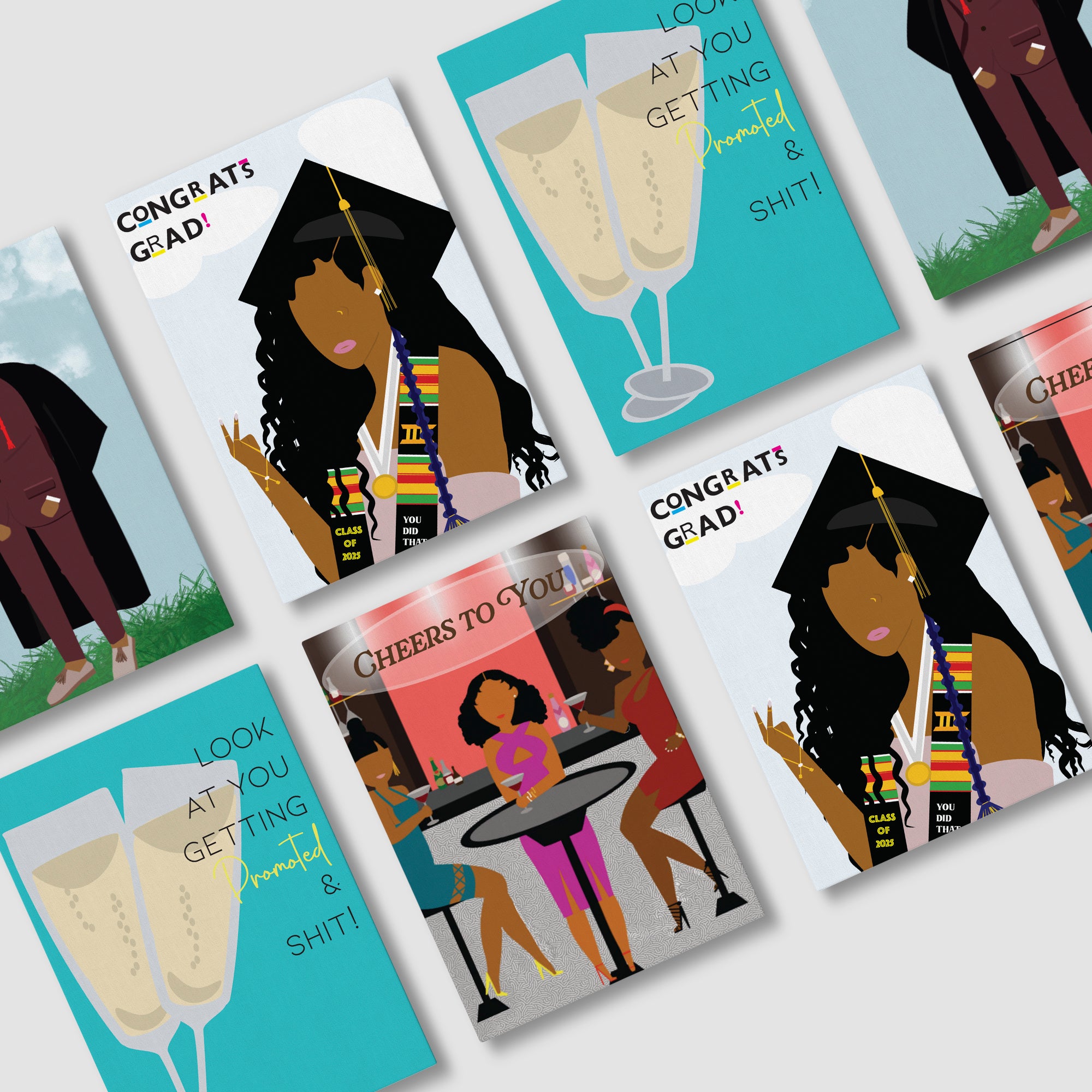 • Four (4) 4.25 x 5.5 Greeting Cards: Cheers To You, Look At You Getting Promoted & Shit, Congrats Grad For Her, Congrats Grad For Him Sky